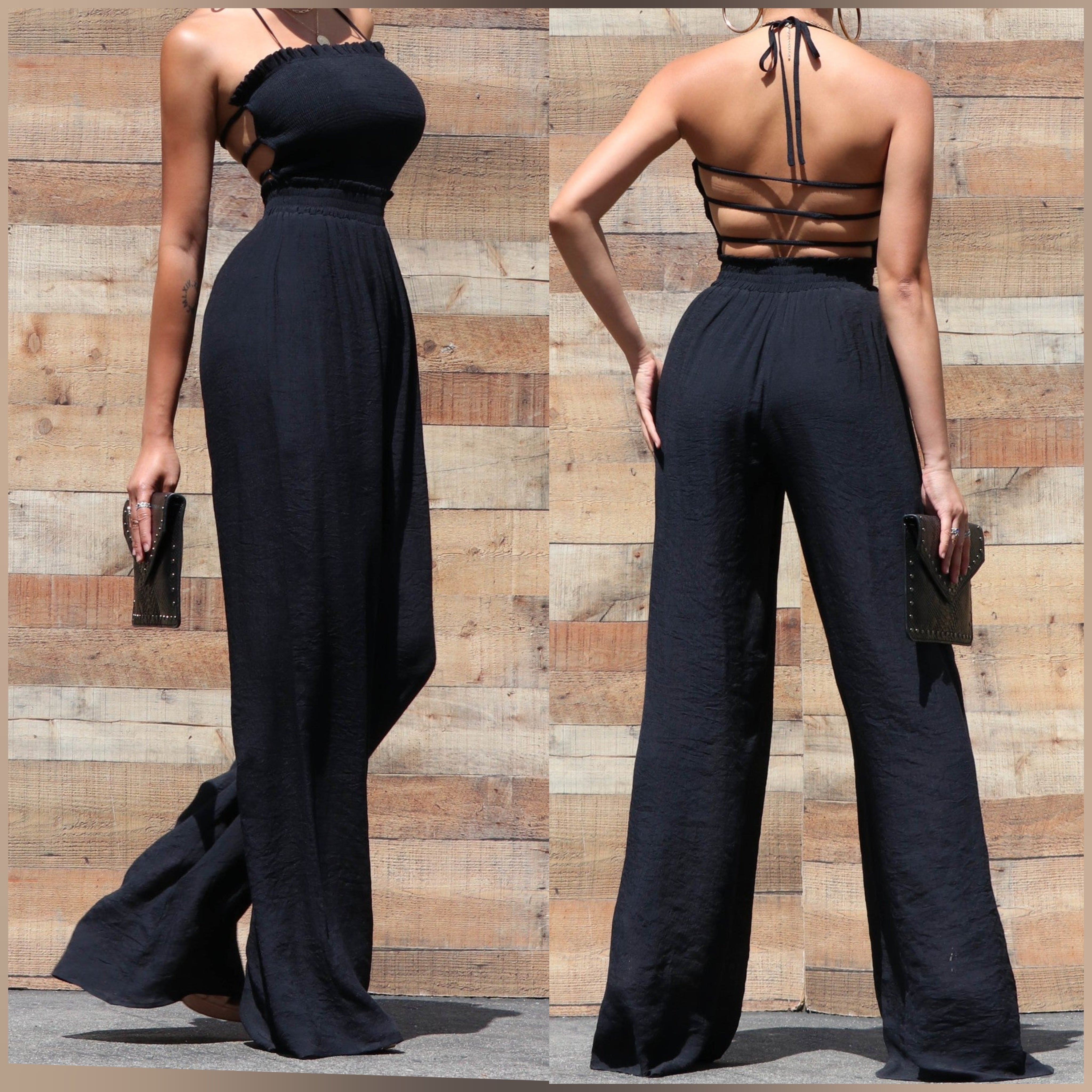 STRIPED WOVEN JUMPSUIT TOP SMOCKING W/HALTER NECK